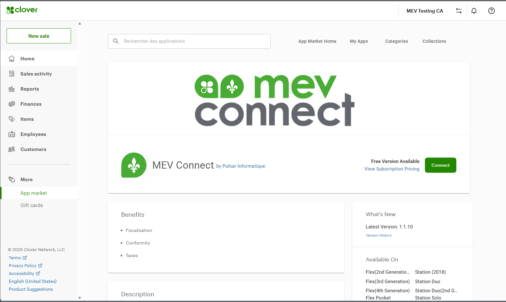- – Once the MEV Connect app is visible on your Clover dashboard, click on Connect.